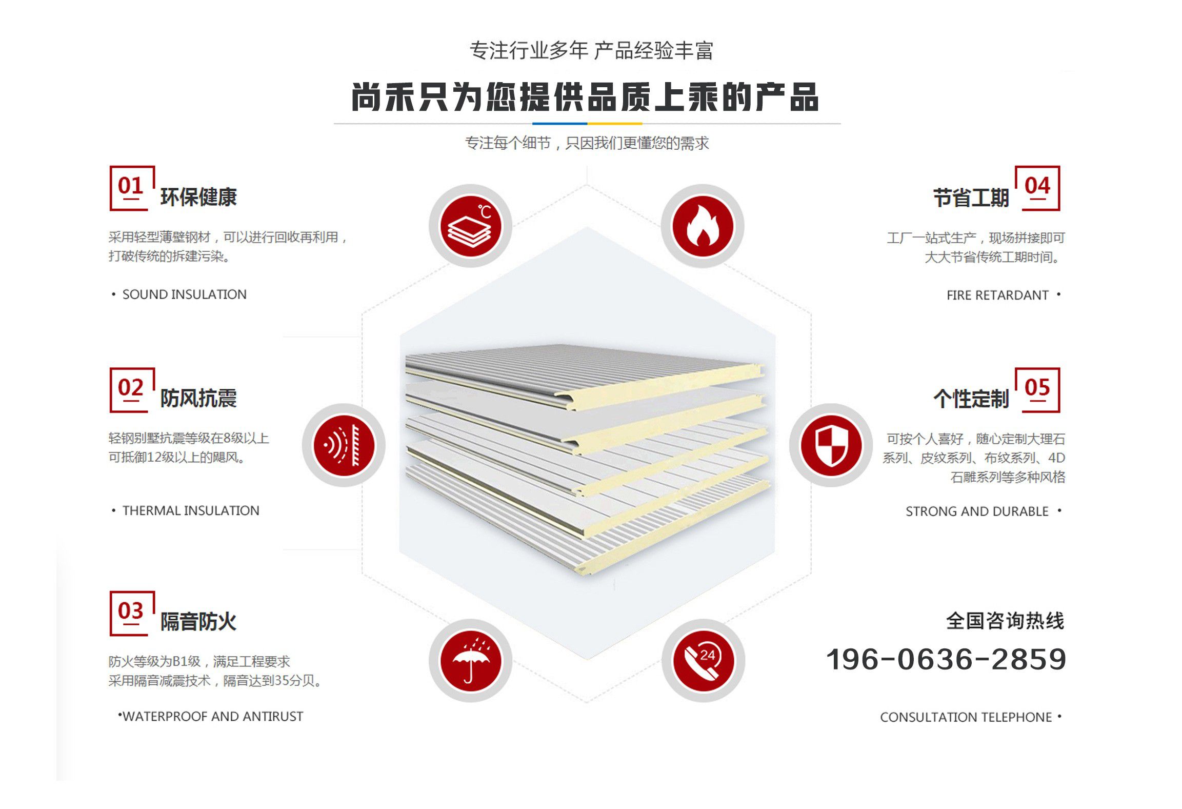 山東尚禾經貿有限公司是集板材設計、研發(fā)、生產、施工、一體化的科技公司,并在同行業(yè)中率先通過了質量、環(huán)境、安全管理體系認證。公司2011年投入資金2000余萬元引進世界先進的聚氨酯節(jié)能板連續(xù)生產線、意大利進口發(fā)泡系統,采用六組份在線自動操作混合澆注技術,在線一次性完成社會配料中心或工廠的配比混合工藝,并可以根據溫度在線自動調整,從而生產處與眾不同的高強度、節(jié)能型、綠色環(huán)保的聚氨酯夾芯板。(其使用年限高于同行業(yè)其他品牌5-10年)  公司主要經營范圍包括聚氨酯夾芯板,PU夾芯板,冷庫板,潔凈板,聚氨酯冷庫板,冷庫保溫板的設計、生產、銷售、技術指導、安裝及一體、以及進出口業(yè)務,是中部六省最大的綠色節(jié)能建材生產基地。聚氨酯夾芯板年產200萬平方米、PU夾芯板、冷庫保溫板500萬平方米、鏈整產業(yè)綜合實力,開創(chuàng)了六省至中西部創(chuàng)新型中小名企總部基地,并將著力推進中國中西部地區(qū)集成房屋住宅產業(yè)化發(fā)展進程。  科技創(chuàng)新、節(jié)能典范。千萬間始終秉承“誠信、合作”的企業(yè)文化精髓,長期致力于鋼板材結構節(jié)能建筑產業(yè),愿與社會各界攜手合作,共鑄綠色、環(huán)保美好未來。 產品具有良好的絕熱、阻燃、隔音、環(huán)保、耐久性能,可廣泛應用于工業(yè)、商用建筑內外墻、以及民用建筑外墻保溫、空調通風系統、專用防火保溫門等領域。  我們始終秉承...